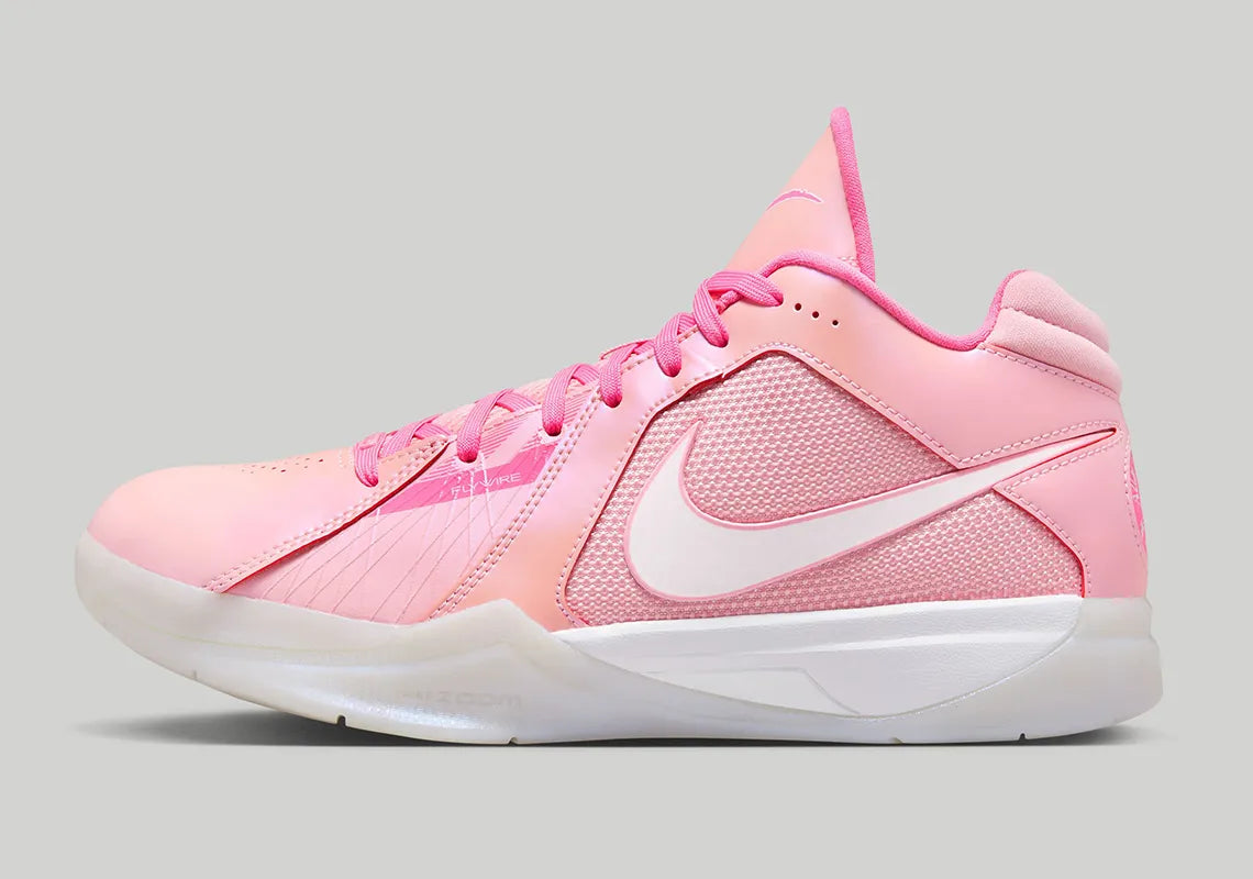 1. **Elegant Design**: The Nike KD 3 "Aunt Pearl" boasts a striking design with a predominantly white upper adorned with delicate pink accents. The floral patterns and subtle hints of pink throughout the shoe symbolize Aunt Pearl's enduring beauty and strength throughout her battle with cancer.