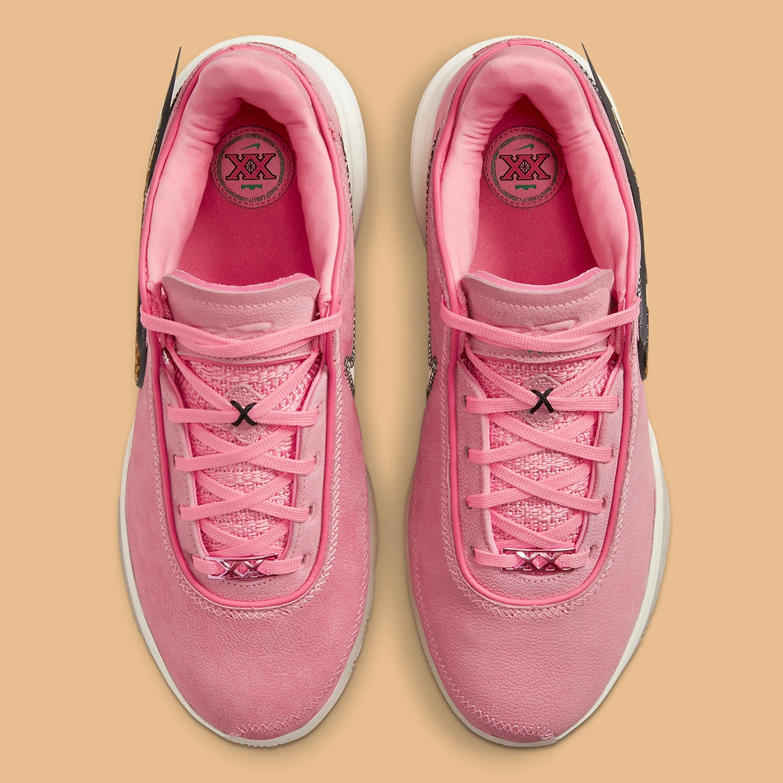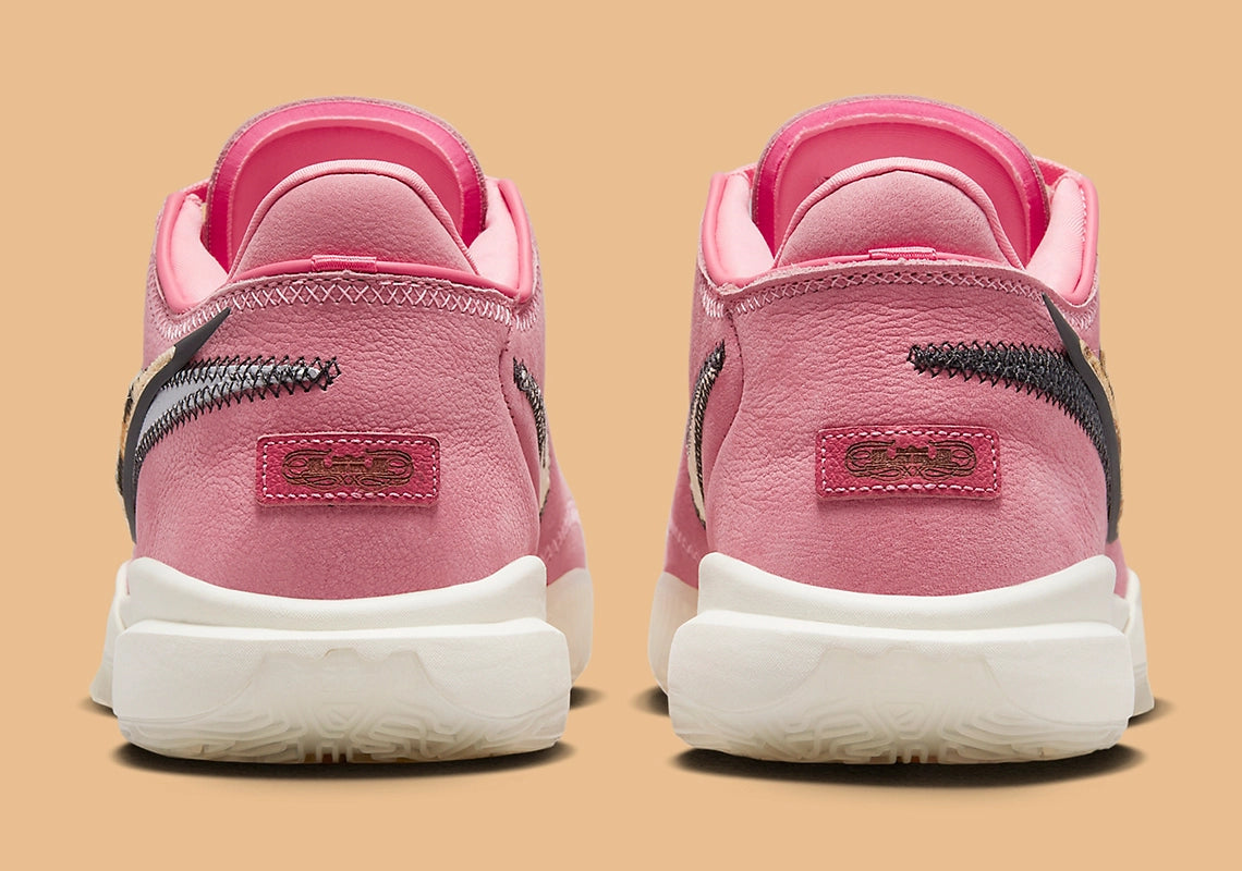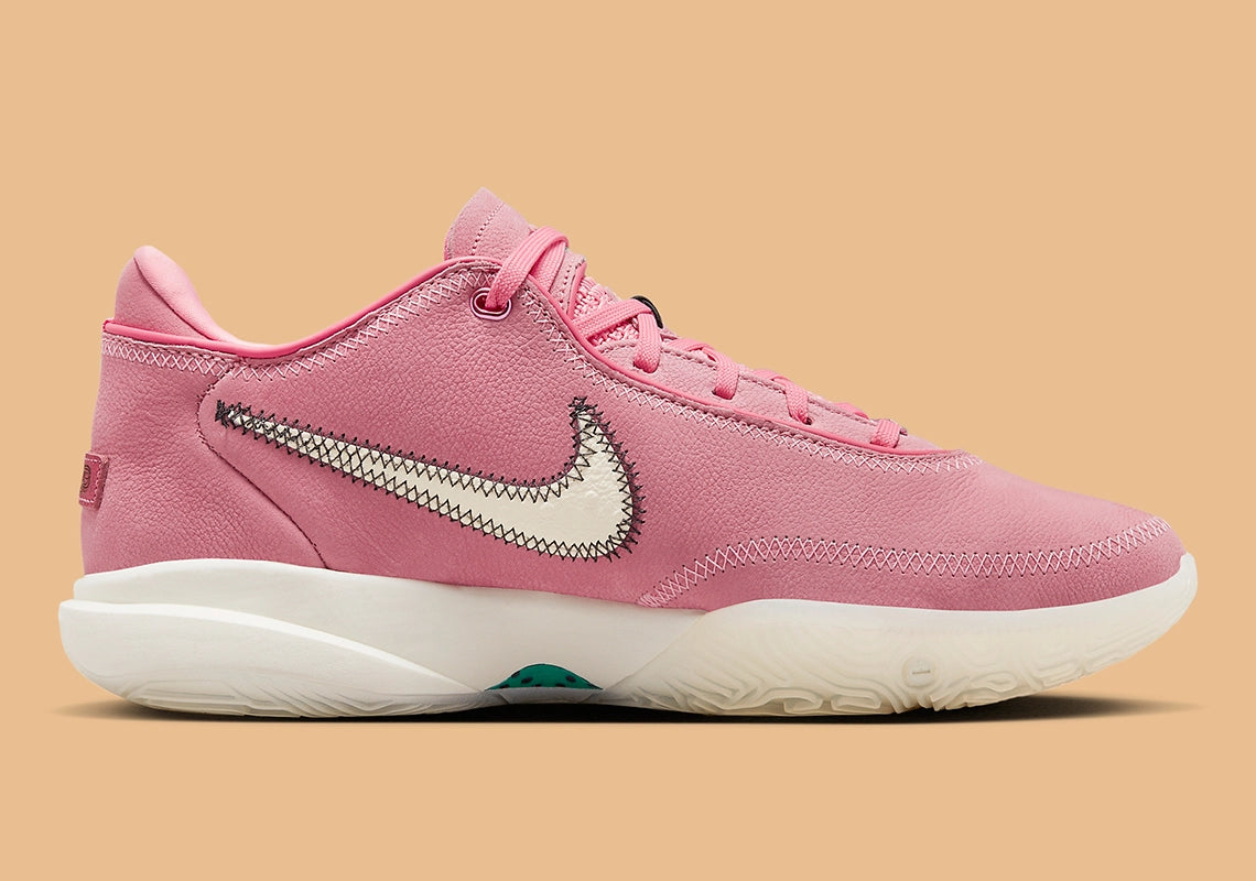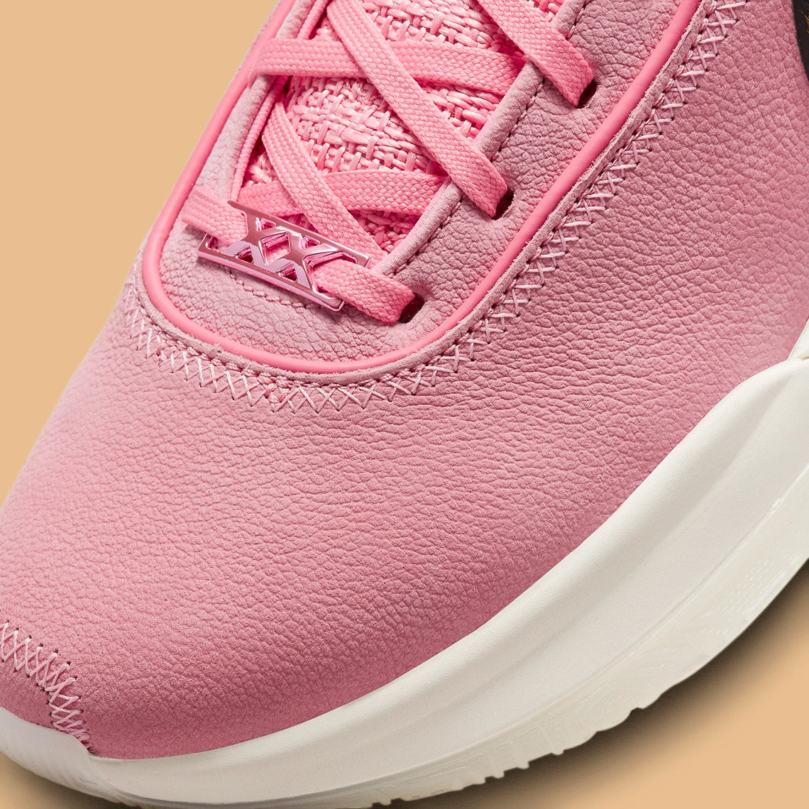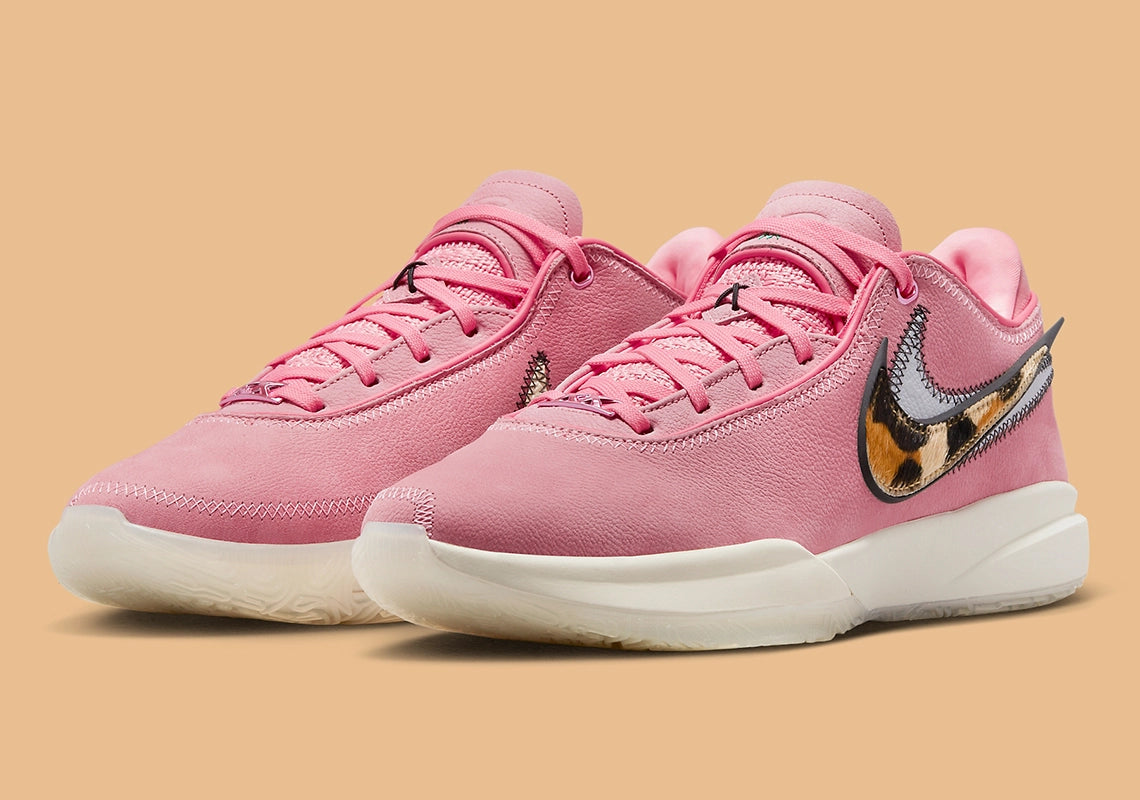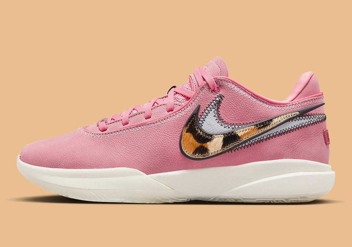 These sneakers celebrate Lebron's 20th year with Nike and the NBA with a sleek silhouette built from premium materials. This pink pair is crafted from grained calf leather and decorated with the usual double-stacked Swooshes on the lateral side, this time with a textured animal-inspired pattern.