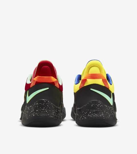 The Nike PG 5 Drew league has red laces on one shoe and yellow on the other, providing a fun and eye-catching contrast.
